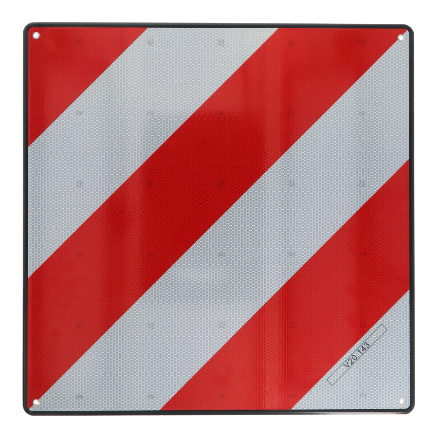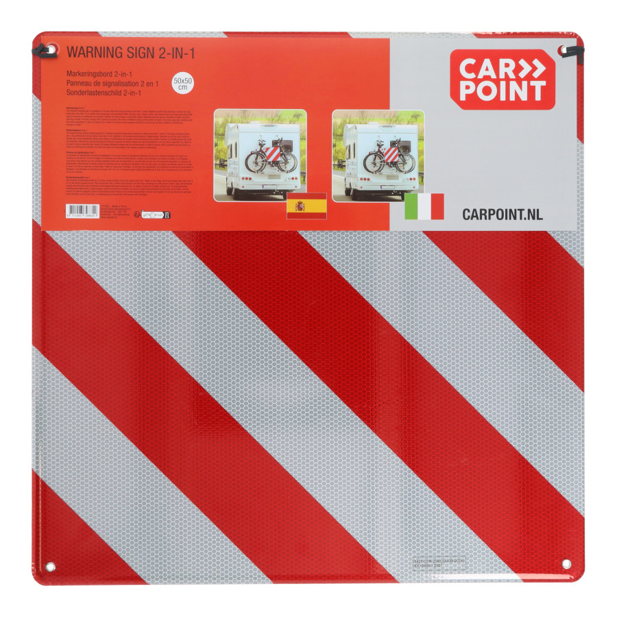 Denna skylt för lång last uppfyller trafikreglerna i Italien och Spanien. Den är tillverkad av aluminium och mäter 50x50 cm. Den har fyra öljetter för montering på en husbil, husvagn eller släpvagn.