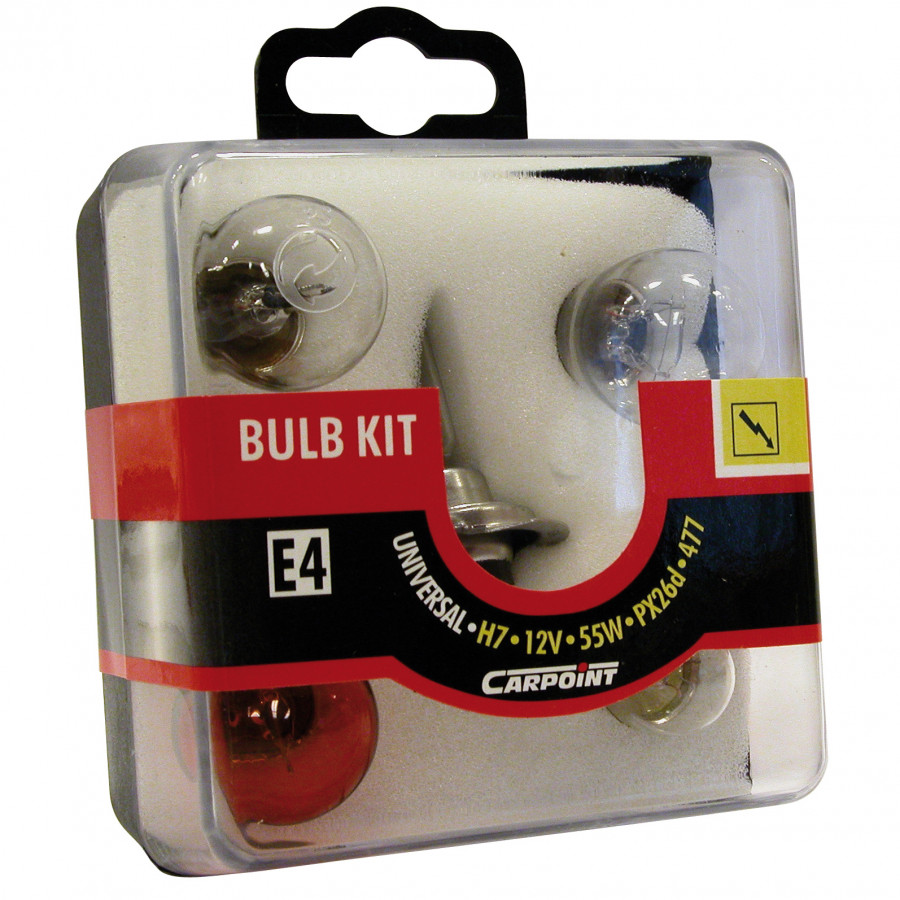 Carpoint 7-delade reservglödlampsset H7 är ett komplett set med 5 vanligaste glödlampor och 2 säkringar. Setet består av följande lampor med E-märke: