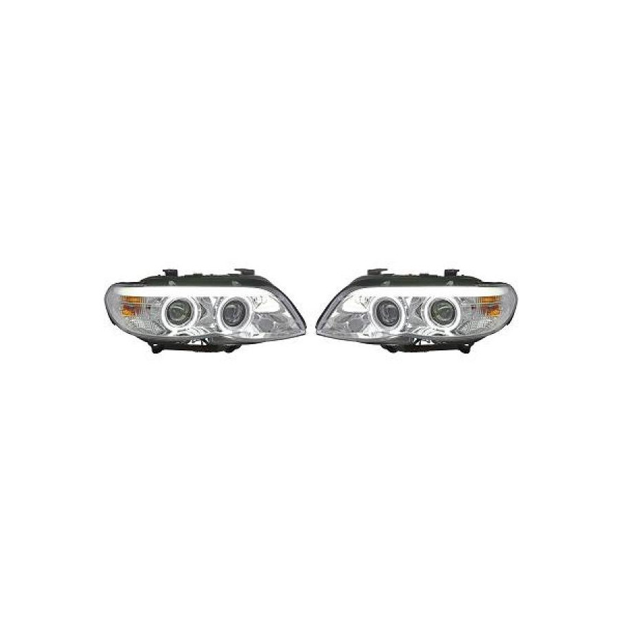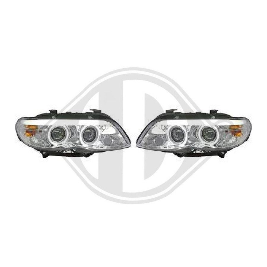 Färg Krom Glasklar Garanti 2 år Applikation Strålkastare sida Uppsättning Lamptyp Halogen Utförande För fordon med strålkastarjustering Version Angel eyes Belysningsfunktion Med varselljus -
