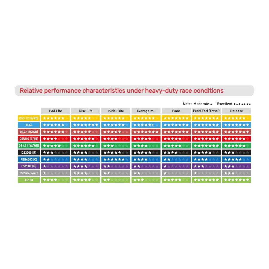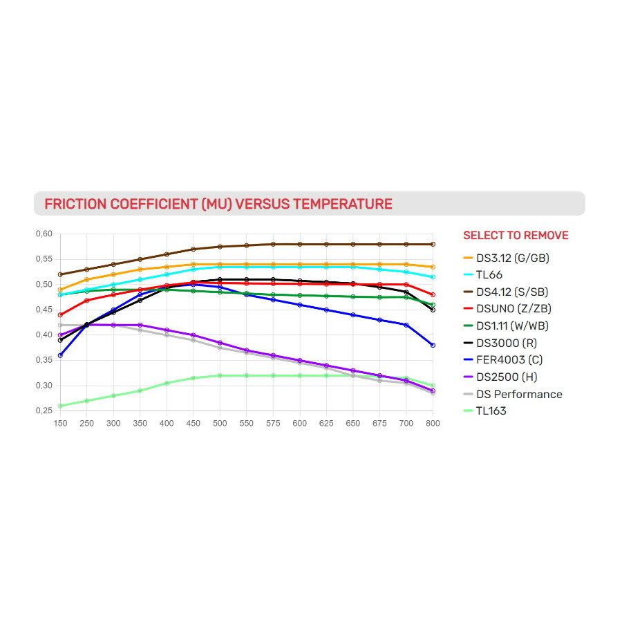 Genomsnittlig friktionskoefficient på 0,41 ger självförtroende och mycket bra bromskraft över ett brett temperaturområde. Detta gäller nästan hela temperaturområdet, där friktionen mot temperaturen minskar med DS Performance.