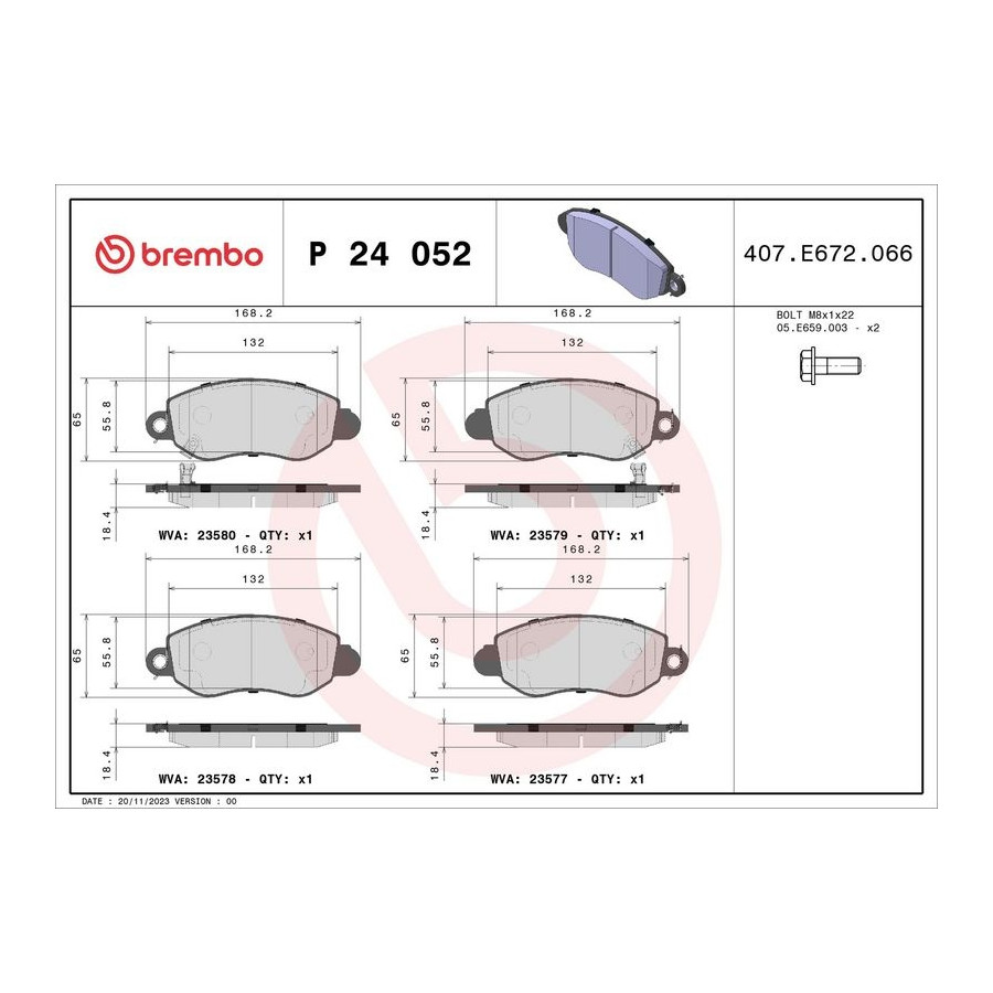 Tillverkare Tillverkare kod Pris A.B.S. 37294 AISIN BPFO-1028 ASHIKA 50-00-0323 ATE 13.0460-3993.2 BELACO BPD1227 BLUE PRINT ADF124214 BORG & BECK BBP1626 BOSCH 0 986 424 691 BRECK 23577 00 703 10 BREMBO P 24 052 (denna produkt) BREMSI BP2887 BSG BSG 30-200-003 Brake ENGINEERING PA1262 CHAMPION 573110CH CHAMPION 573015CH CIFAM 822-320-0 COMLINE CBP31108 COMLINE ADB31108 DELPHI LP1582 DENCKERMANN B110203 DON PCP1665 DT Spare Parts 13.93104 Dr!ve+ DP1010.10.0834 EUROBRAKE 5502222559 FAI AutoParts BP336 FAI AutoParts FPBP207 FAST FT29548 FEBI BILSTEIN 16425 FERODO FVR1461 FERODO FVR1381 FI.BA FBP1275 FREMAX FBP-1203 FTE 9010338 GALFER B1.G102-0597.2 GIRLING 6120063 GIRLING 6114244 HELLA 8DB 355 019-361 JAPANPARTS PA-0323AF JAPKO 500323 JURATEK JCP5167 JURID 573015J JURID 573015D JURID 573110J KAISHIN FK20287 KAMOKA JQ1012762 KAWE 0772 02 KEY PARTS KBP1626 KLAXCAR FRANCE 24817z KRAFT AUTOMOTIVE 6002110 LPR 05P775 MAGNETI MARELLI 363916060556 Tillverkare Tillverkare kod Pris MAGNETI MARELLI 363700424052 MALÒ 1050390 MAPCO 6540 MASTER-SPORT 13046039932N-SET-MS MASTER-SPORT 13046039932N-SET-MSP MAXGEAR 19-0672 MAXTECH 3027004 METELLI 22-0320-0 METZGER 1170365 MEYLE 025 235 7718/W MEYLE 025 235 7718/PD MINTEX MDB2061 MOTAQUIP LVXL644 NATIONAL NP2036 NK 222559 OPEN PARTS BPA0772.02 OPTIMAL 12019 OPTIMAL BP-12019 OPTIMAL BP-77212 OPTIMAL 77212 PAGID T9098N QUARO QP4634 QUARO QP4634C QUINTON HAZELL BP1244 RAICAM RA.0756.0 REMSA 0772.02 ROADHOUSE 2772.02 ROTINGER RT 2PD15820 SASIC 6216112 SCT Germany SP 281 PR SKF VKBP 80798 A SKF VKBP 80489 A STELLOX 783 002L-SX STELLOX 783 002B-SX STELLOX 783 002-SX SWAG 50 91 6425 TEXTAR 2357701 TOPRAN 302 053 TRISCAN 8110 16007 TRUSTING 329.0 TRW GDB1424 TRW GDB2006 VAICO V25-0267 VALEO 301432A VALEO 301432 VALEO 872577 VALEO 598432 WAGNER WBP23434A WOKING P6723.02 ZIMMERMANN 23434.185.1 fri.tech. 329.0 -