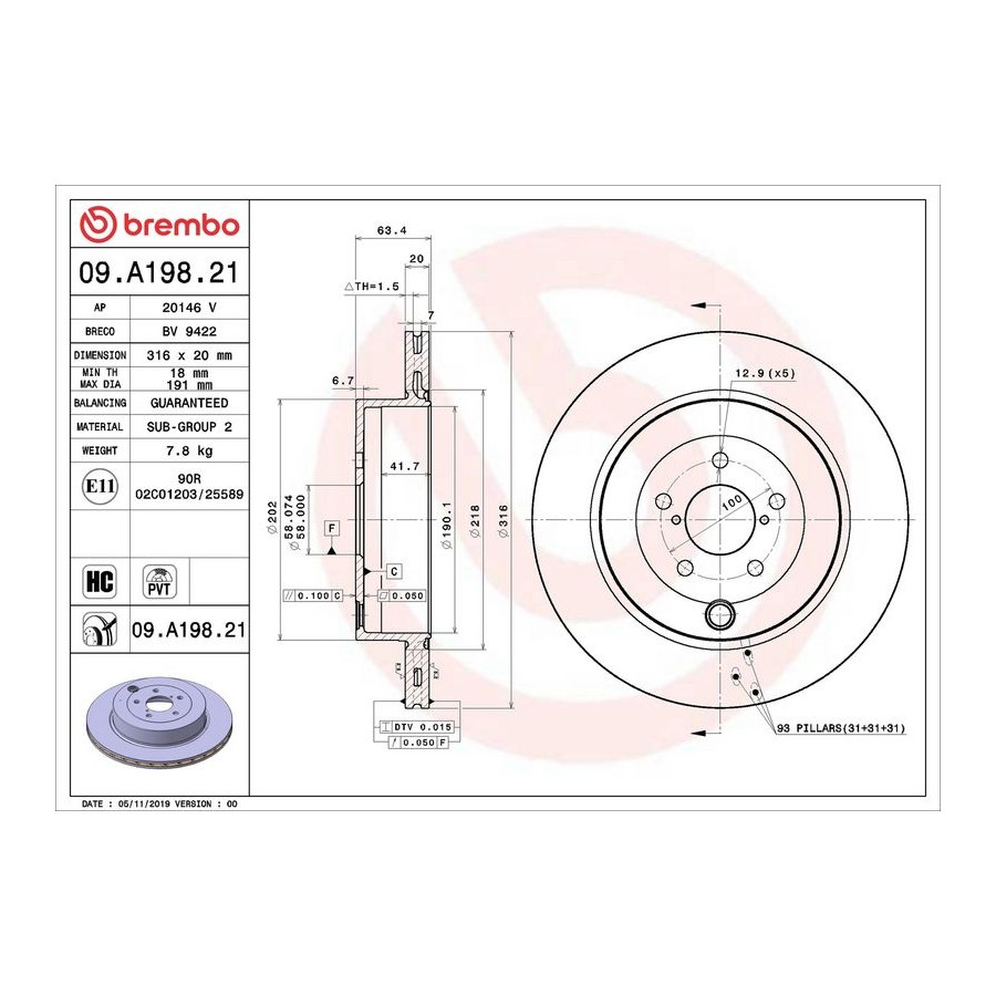Ytterdiameter [mm] 316 Bromsskivetyp Ventilerad på insidan Intern ventilation Diameter (mm) 316 Yta Belagd Hålantal 5 Bromspedaler Exklusive Centreringsdiameter [mm] 58 Bearbetning Höguppkolat Garanti 2 år Höjd [mm] 63 Bromsskivans tjocklek (mm) 20 Minsta tjocklek (mm) 18 Liknande produkter från andra tillverkare