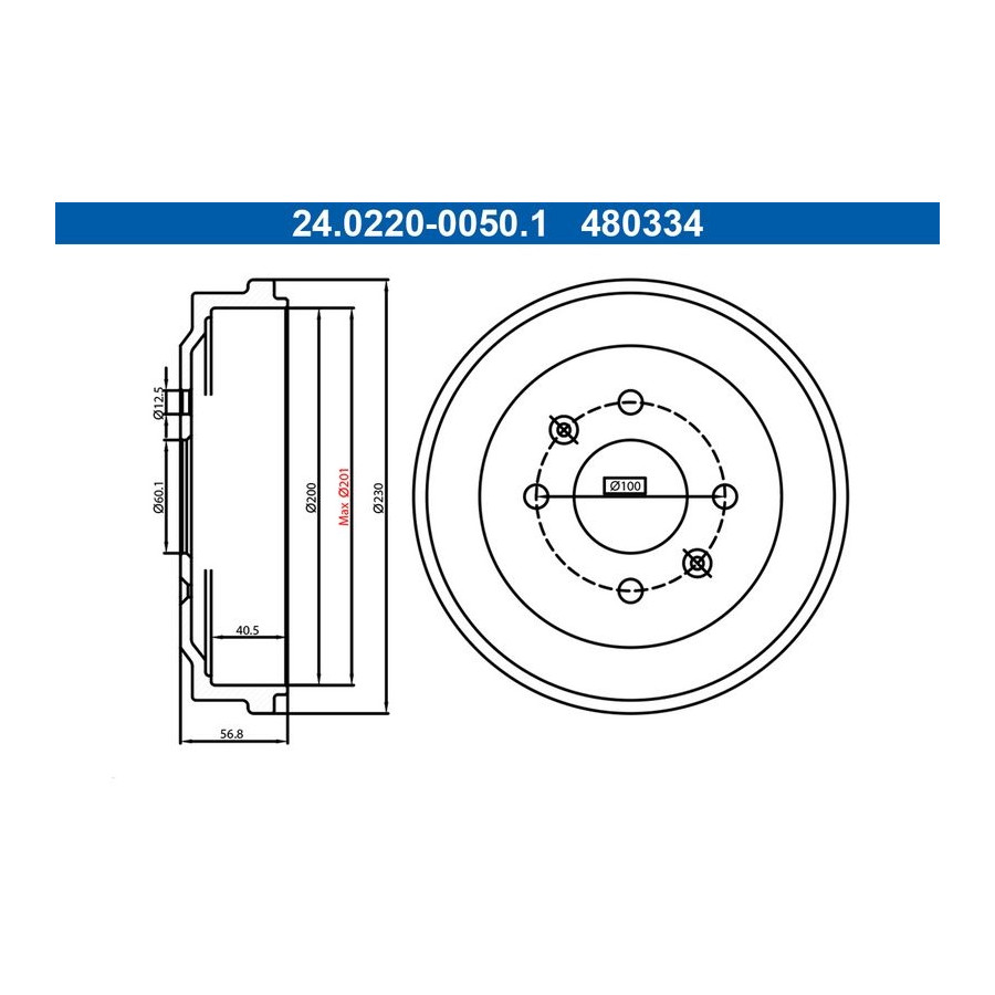 Hålantal 4 Hålkrets-Ø [mm] 100,0 Diameter intag [mm] 60,1 Kontrollmärke E1 90R-02D0324/1876 MAPP-kod tillgänglig Garanti 2 år Bromstrummans diameter utvändig [mm] 230,0 Bromstrummans diameter inuti [mm] 200,0 Håldiameter [mm] 12,5 Bromstrummans höjd totalt [mm] 56,8 Intern bromstrumma höjd [mm] 40,5 max. storlek på bromstrumman [mm] 201,0 -