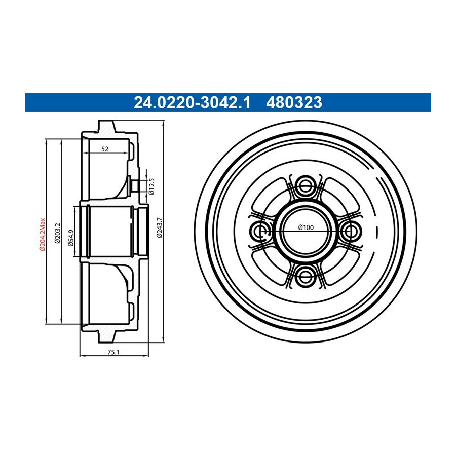 Kompletteringsartikel/tilläggsinfo 2 Utan hjullager Utan ABS-sensorring Utan hjulbultar Hålantal 4 Hålkrets-Ø [mm] 100,0 Diameter intag [mm] 54,9 MAPP-kod tillgänglig Garanti 2 år Bromstrummans diameter utvändig [mm] 243,7 Bromstrummans diameter inuti [mm] 203,2 Håldiameter [mm] 12,5 Bromstrummans höjd totalt [mm] 75,1 Intern bromstrumma höjd [mm] 52,0 max. storlek på bromstrumman [mm] 204,2 Liknande produkter från andra tillverkare
