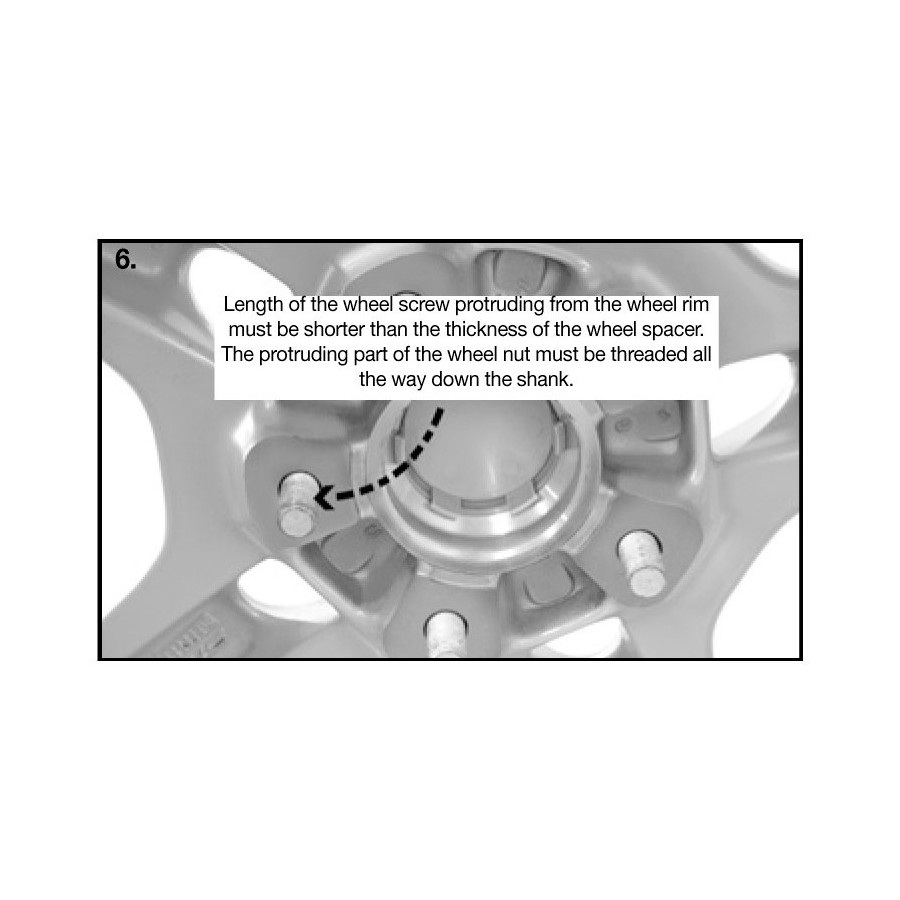 Hjuldistansen måste monteras på axialnavet med hjälp av de medföljande monteringsbultarna. Hjulen måste sedan monteras med hjälp av de original hjulbultar som medföljer hjulen. Längden på originalskruven som sticker ut från fälgen måste nödvändigtvis vara mindre än hjuldistansens bredd!