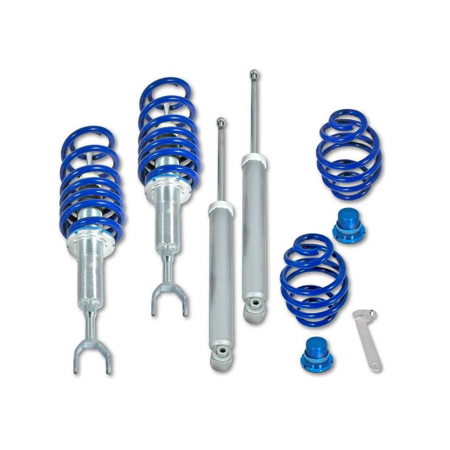 Uppsättningen är steglöst justerbar i höjd med de medföljande nycklarna. Stötdämparna är gjorda av galvaniserat stål, och rätter av aluminium. Genom att injicera med en skyddande olja eller spray uppsättningen förblir fortfarande justeras efter en längre tid. Den coilover är utformad med bästa möjliga kvalitet / pris förhållande.