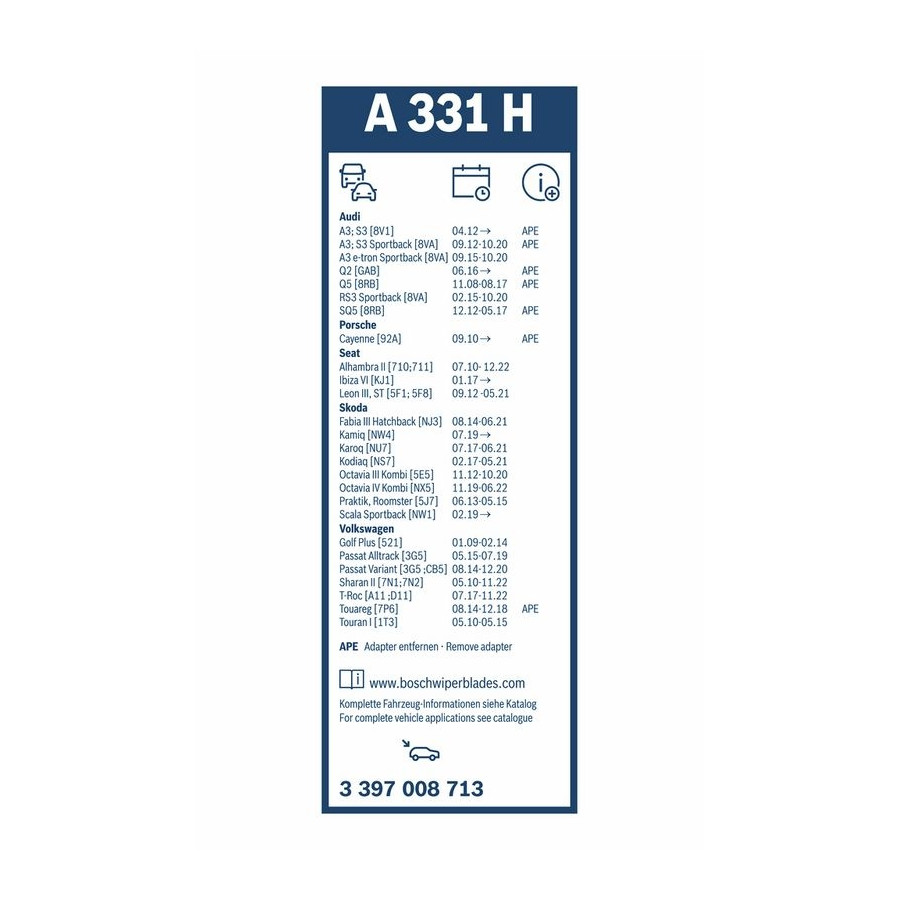 A3 (8V1, 8VK) | 04.2012-10.2020 2.0 TDI quattro - 1968ccm, 150pk, 110kw - CRBC, CRLB, DCYA