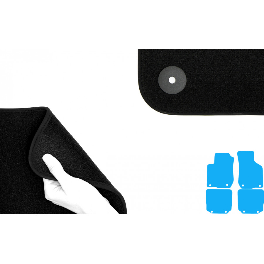 Du kan enkelt och säkert placera dessa velourmattor på bilens monteringshål. Undersidan är gjord av robust NSF-gummi och den högkvalitativa veluren garanterar en mycket lång livslängd och brusreducering. Tack vare den exklusiva bandkanten och den tjocka NSF-ryggen får du också önskad komfort utöver det lyxiga utseendet! I vissa fall måste du överföra fästet på dina gamla mattor och / eller en matta kan bestå av ett stycke (MPV / buss).