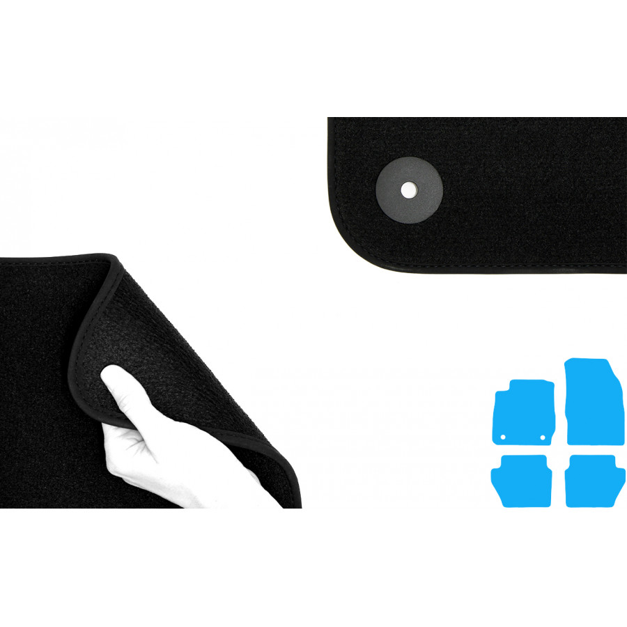 Du kan enkelt och säkert placera dessa velourmattor på bilens monteringshål. Undersidan är gjord av robust NSF-gummi och den högkvalitativa veluren garanterar en mycket lång livslängd och brusreducering. Tack vare den exklusiva bandkanten och den tjocka NSF-ryggen får du också önskad komfort utöver det lyxiga utseendet! I vissa fall måste du överföra fästet på dina gamla mattor och / eller en matta kan bestå av ett stycke (MPV / buss).