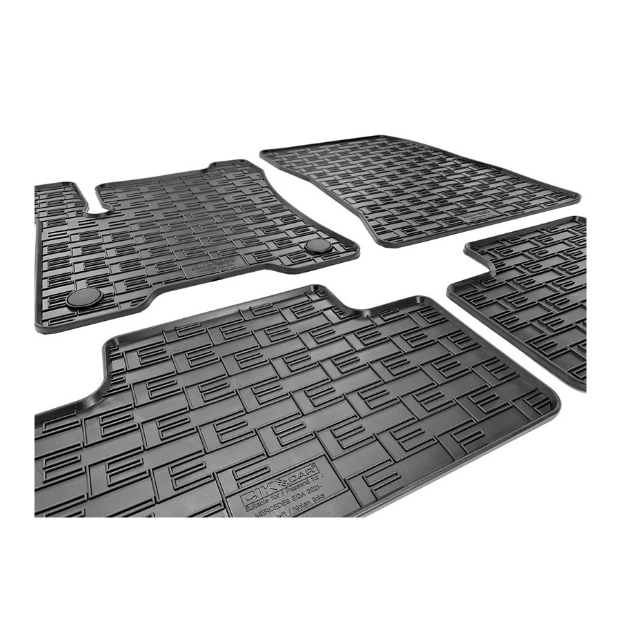Bilmattor lämpliga för Mercedes EQA (H243) 2021-Dessa bilmattor i gummi är speciellt skräddarsydda för din biltyp och kommer därför att passa exakt. De har även de ursprungliga fästpunkterna som säkerställer att gummimattan sitter stadigt på plats, vilket ökar säkerheten. Det finns ytterligare ett halkfritt lager under för att mattan inte ska glida iväg Bilmattor är en viktig barriär mellan bilens matta och smutsen och fukten som kommer från dina skor. De är speciellt designade för att skydda mattan och ditt bilgolv från smuts, slitage och salt. Dessa bilmattor har även en upphöjd kant, vilket håller smuts och fukt inne i mattan. Detta håller bilgolvet rent och torrt Eftersom dessa mattor är gjorda av gummi är de lätta att rengöra; du kan ta bort dem från bilen och klappa ut dem, eller torka av dem med en fuktig trasa.Produktfördelar: Skräddarsytt Idealiskt skydd för bilens interiör Tillverkad av högkvalitativt gummi Lätt att rengöra