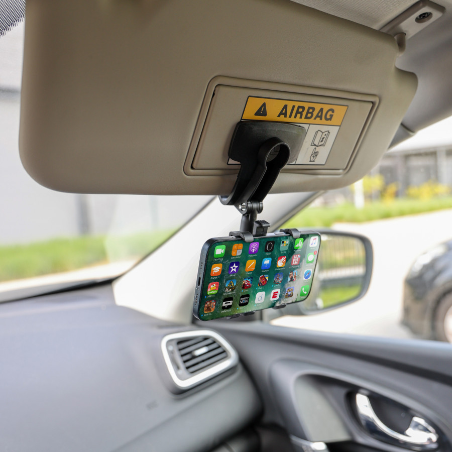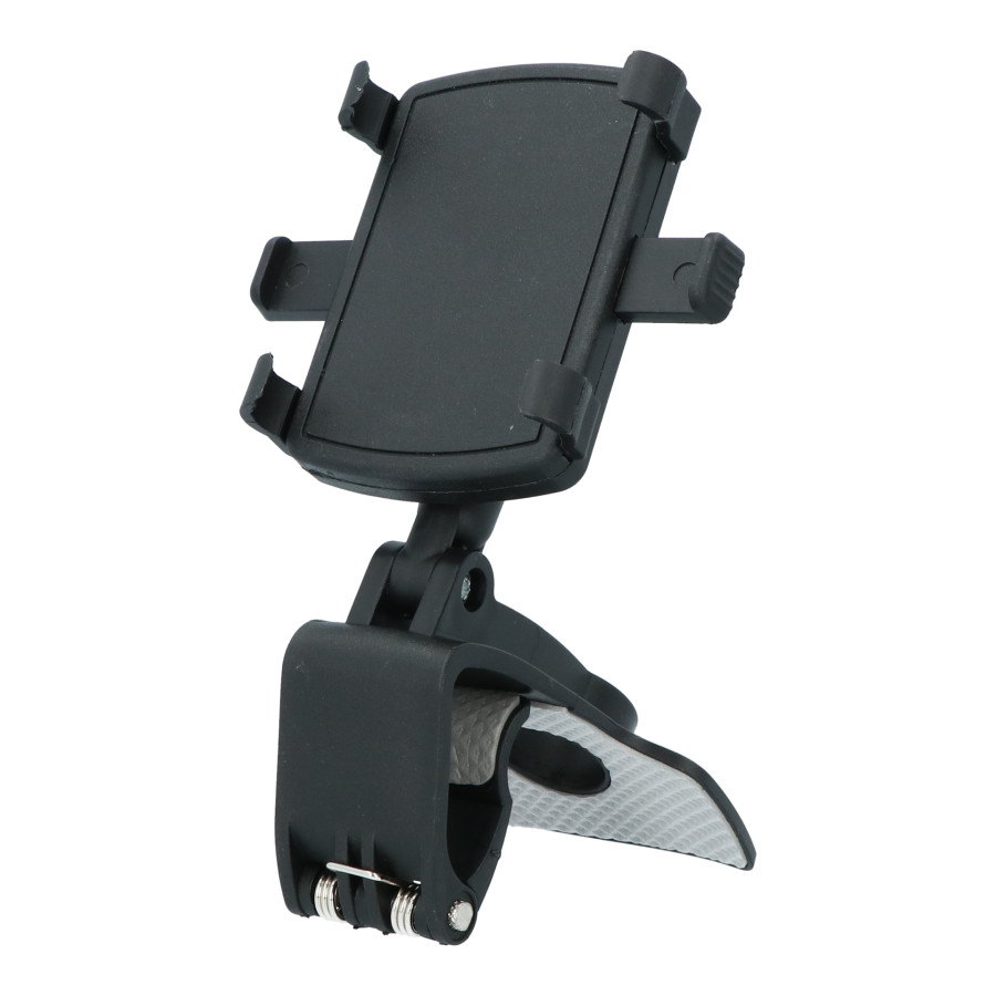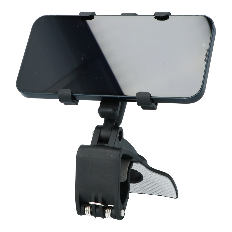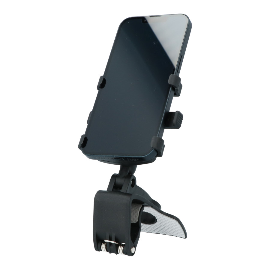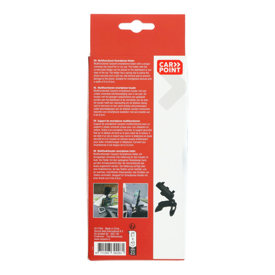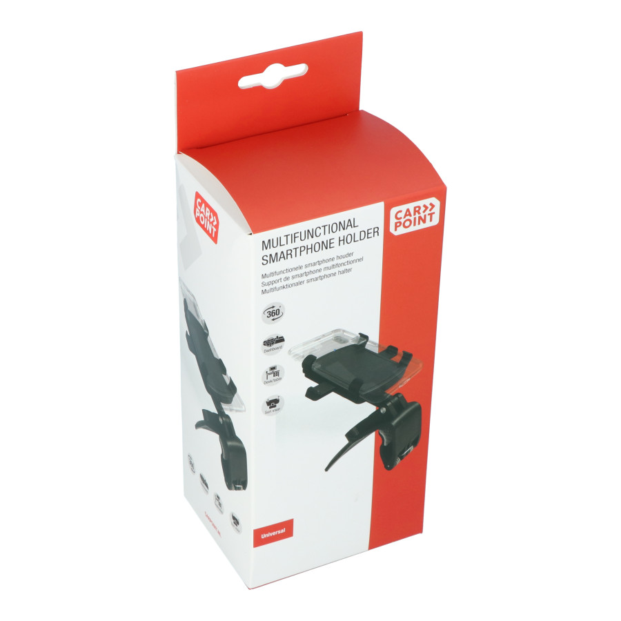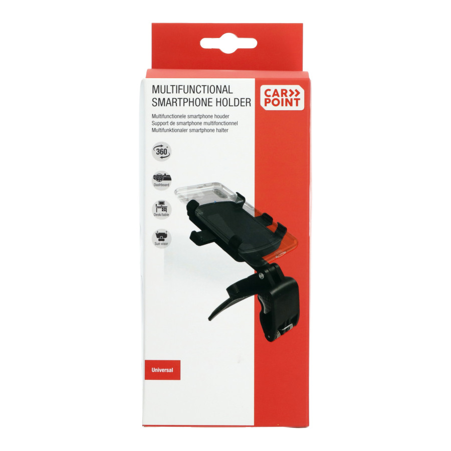 Multifunktionell Carpoint smartphonehållare med en unik universell bilklämma. Hållarens böjda basdesign gör att den kan monteras på bilens instrumentbräda, solskydd eller backspegel. Den har en fjäderbelastad spärr för att säkert hålla din telefon och en mjuk, halkfri silikonkudde för att förhindra skador.