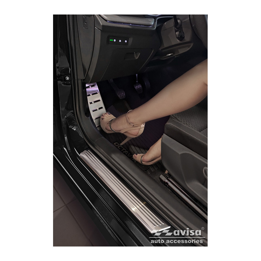 Fotstöd i stål lämpligt för Skoda Octavia (NX_) (Liftback & Kombi) 2020-. Avisas fotstöd är tillverkade av stål, vilket inte bara ger skydd utan också din bil ett elegant utseende. Materialet är robust, hållbart och väderbeständigt, vilket garanterar många års användning. Med över 30 års erfarenhet är Avisa ledande inom design och tillverkning av dessa tillbehör. Installation: monteringsdetaljer ingår.