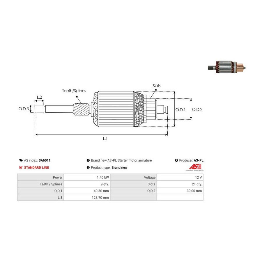 Ytterdiameter [mm] 49,30 Spänning [V] 12 Tandantal 9 Kvalitet Standard line Längd 1 [mm] 128,7 Nominell effekt [kW] 1,4 Rotationsriktning Rotation medsols Garanti 2 år Ny del utan deposition Liknande produkter från andra tillverkare