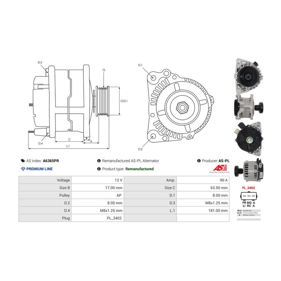 Tillverkare Tillverkare kod Pris AES 595.522.090.050 ALANKO 10442224 AS-PL A6365PR (denna produkt) BTS Turbo G102425 CASCO CAL30107AS CASCO CAL30107GS CASCO CAL30108GS CEVAM 4011 CV PSH 595.522.090.050 CV PSH 595.522.090.265 CV PSH 595.522.090.340 DA SILVA 011586 DA SILVA JA011586 -
