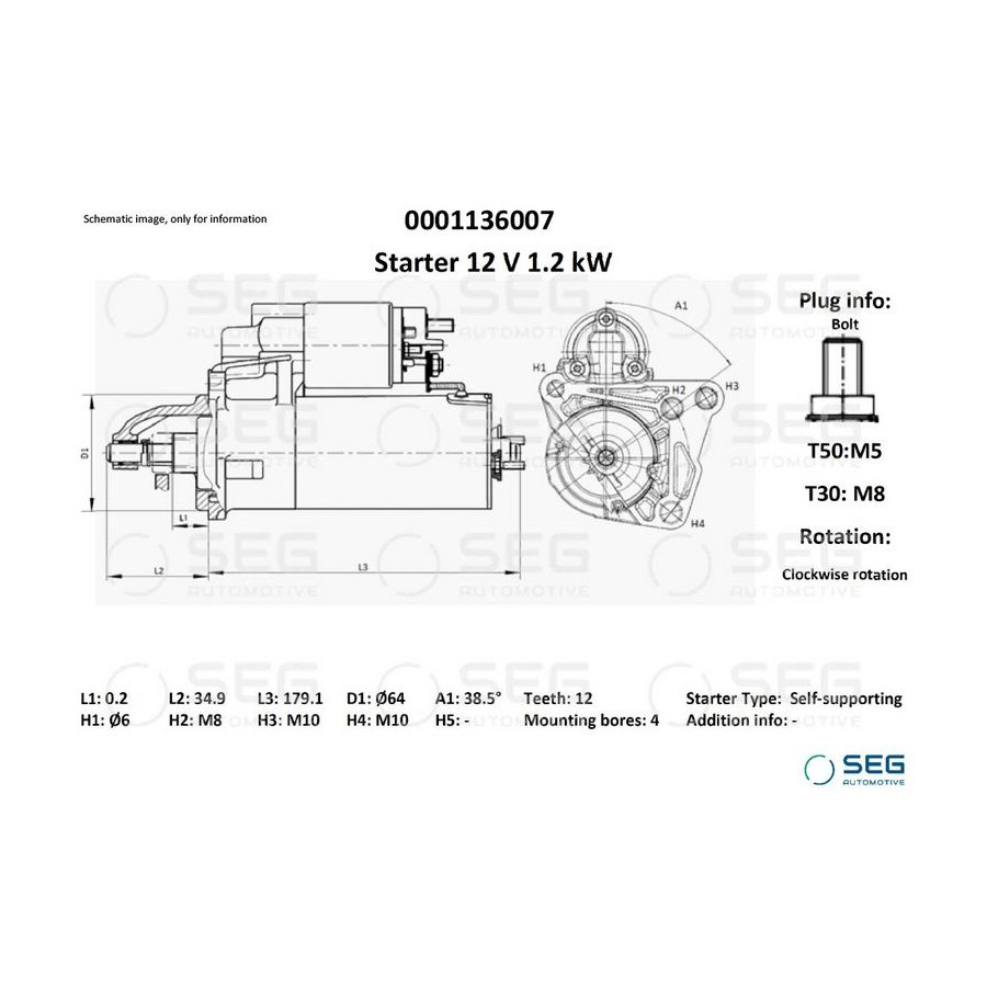 Tandantal 12 Nominell effekt [kW] 1,2 Antal fästhål 4 Rotationsriktning Rotation medsols Spänning [V] 12 Position/Grad R38,5 Klämma T50: M5; T30: M8 Kontaktutförande-ID Bult Garanti 2 år Längd [mm] 214 Flänsdiameter [mm] 64 Liknande produkter från andra tillverkare