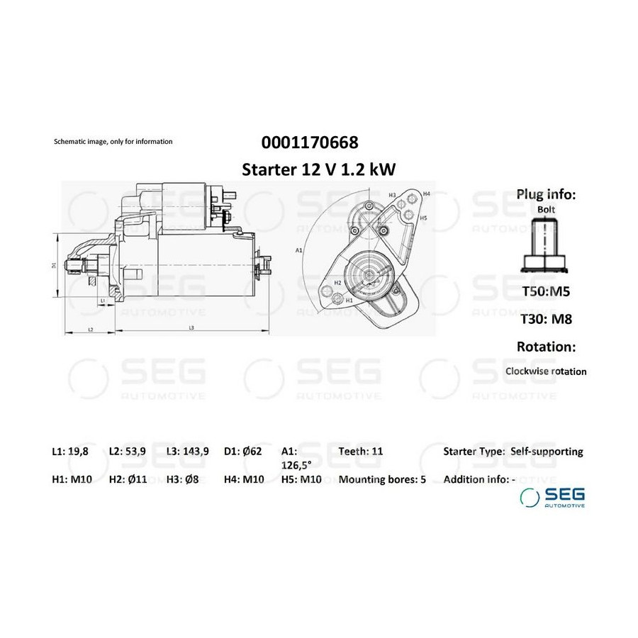 Tandantal 11 Nominell effekt [kW] 1,2 Antal fästhål 5 Rotationsriktning Rotation medsols Spänning [V] 12 Position/Grad R126,5 Klämma T50: M5; T30: M8 Kontaktutförande-ID Bult Garanti 2 år Längd [mm] 197,8 Flänsdiameter [mm] 62 Liknande produkter från andra tillverkare