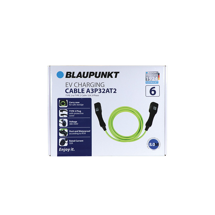 En Blaupunkt laddkabel är konstruerad enligt IP54-klassificeringen, vilket gör kabeln säker för utomhusbruk vid alla väderförhållanden. Total längd på 8 meter ger dig maximal flexibilitet. 32A-kapacitet levererar säkert upp till 22 kW i tre faser. Praktisk transport- och skyddsväska ingår. CE-certifieringen har utförts av ett ledande oberoende laboratorium.