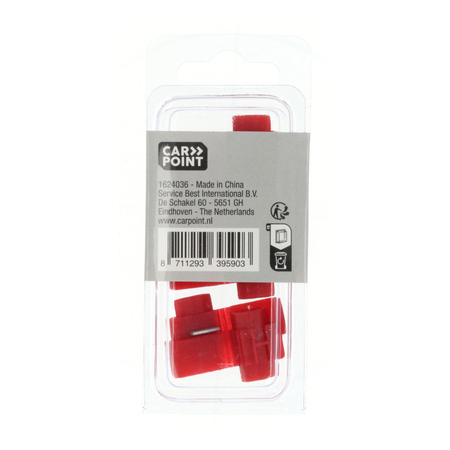 Röd Carpoint isolerad grenkontakt 1563. Denna grenkontakt är lämplig för ett ledartvärsnitt på 0,5-1,5 mm². Terminalen används där elektriska förgreningar önskas eller är nödvändiga. Isolationsförskjutningsanslutningen säkerställer kontakt med båda kablarna. Detta gör installationen avsevärt enklare, särskilt för installation i fordonselektronik och kopplingsskåp. Grenkontakterna levereras i blisterförpackningar om 5.