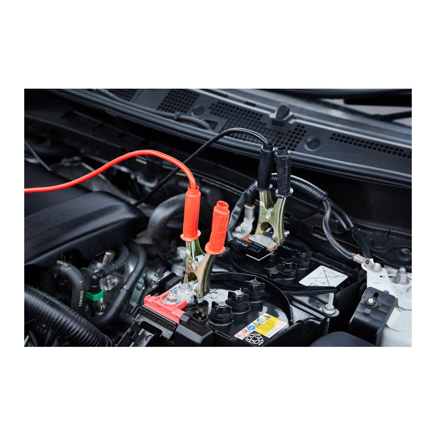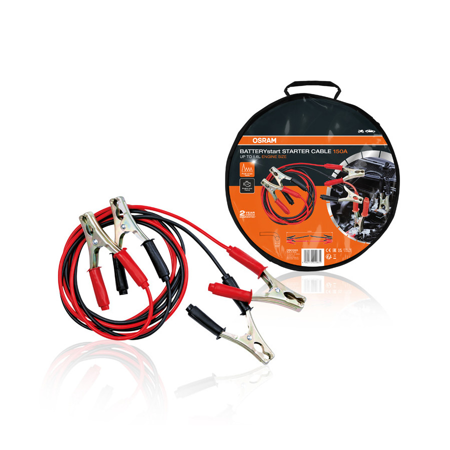 BATTERYstart STARTKABEL 150A från OSRAM är en högkvalitativ startkabel för professionellt och privat bruk. Kablarna är gjorda av kopparbeklädd aluminium, vilket minskar kabelns motstånd och möjliggör en konstant och effektiv kraftöverföring. Startkabeln är 2,5 meter lång och har ett tvärsnitt på 6 mm². Tack vare dess längd och tvärsnitt kan fordon med bensinmotorer upp till 1,6 liter startas, eftersom en toppström på upp till 150 A och en likström på 75 A kan uppnås. Den är lämplig för 6V och 12V.