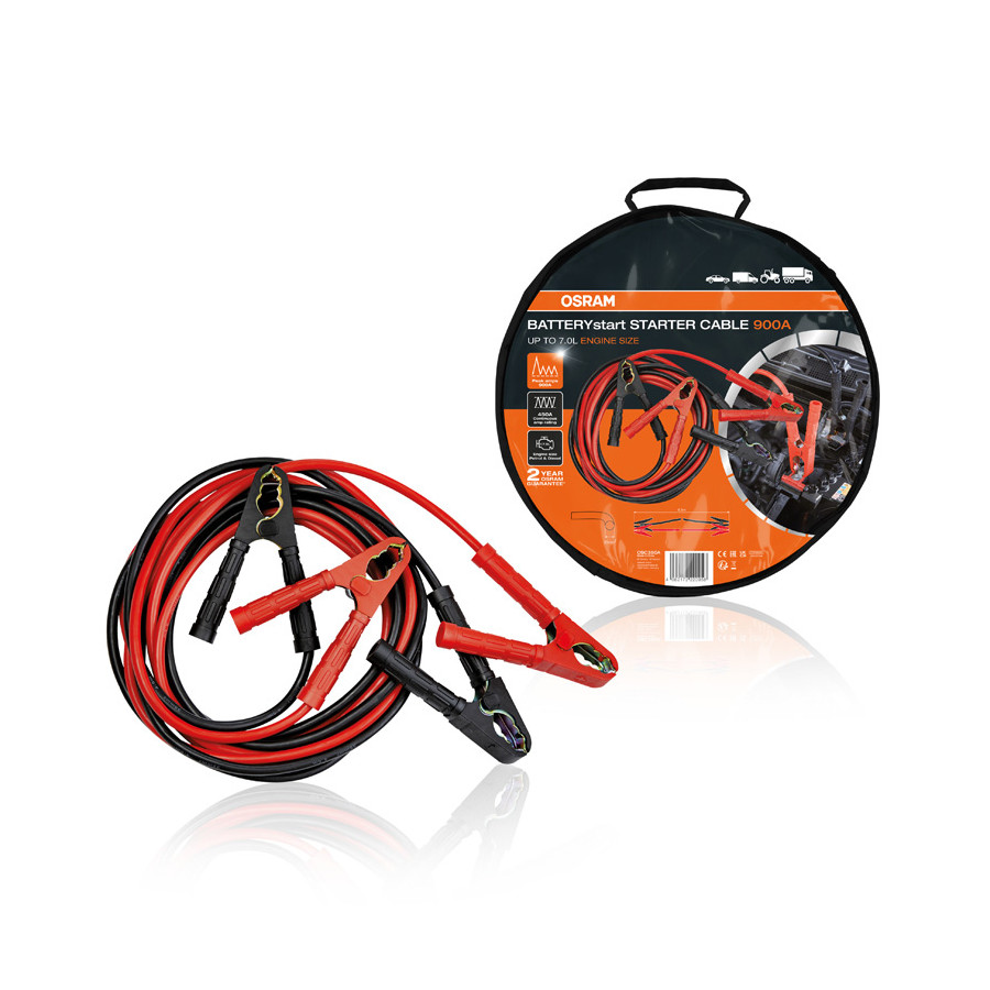 För att förhindra kraftigt slitage är OSRAM BATTERYstart STARTKABEL 900A mantlad i flexibel men hållbar PVC och de isolerade terminalerna ger extra säkerhet och hållbarhet. De olika färgerna på kablarna och handtagen på polerna minskar risken för att de positiva och negativa polerna förväxlas och därmed risken för felaktig anslutning till batteriet.